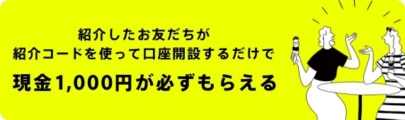 新規口座開設の際に下記紹介コードの入力で1,000円が最短翌日に口座へ入金されるキャンペーンです。